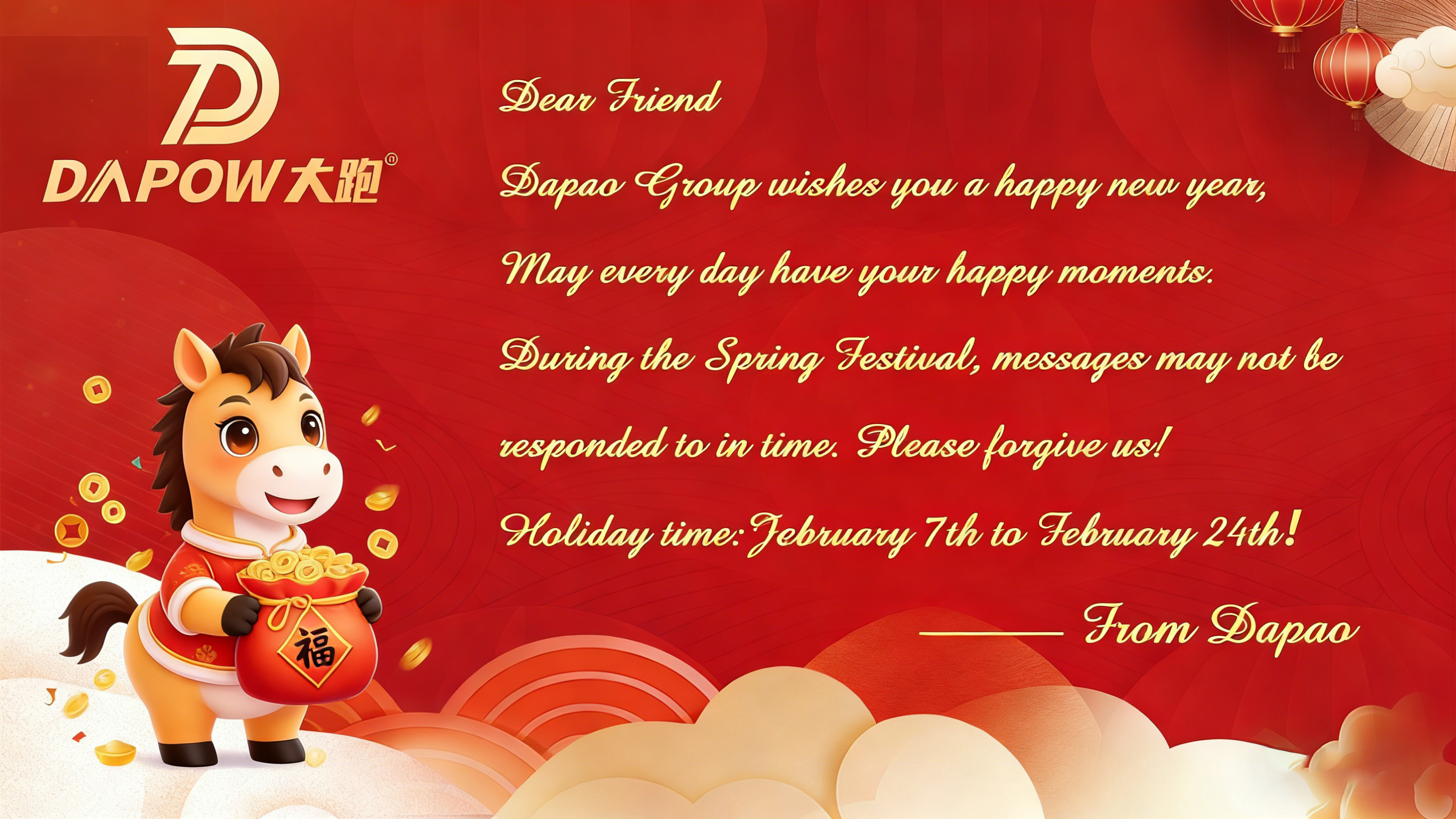As the Spring Festival is approaching, we would like to inform you of our company’s vacation arrangement. Our company will be closed from February 7th, 2026 to February 24th,2026.so that our employees can celebrate this important occasion with their families. Normal operations will resume on February 25th, 2026.During this time, our website will remain accessible, but please note that responses to inquiries and orders may be delayed. We recommend that you make the necessary arrangements before the holiday to ensure a smooth experience.